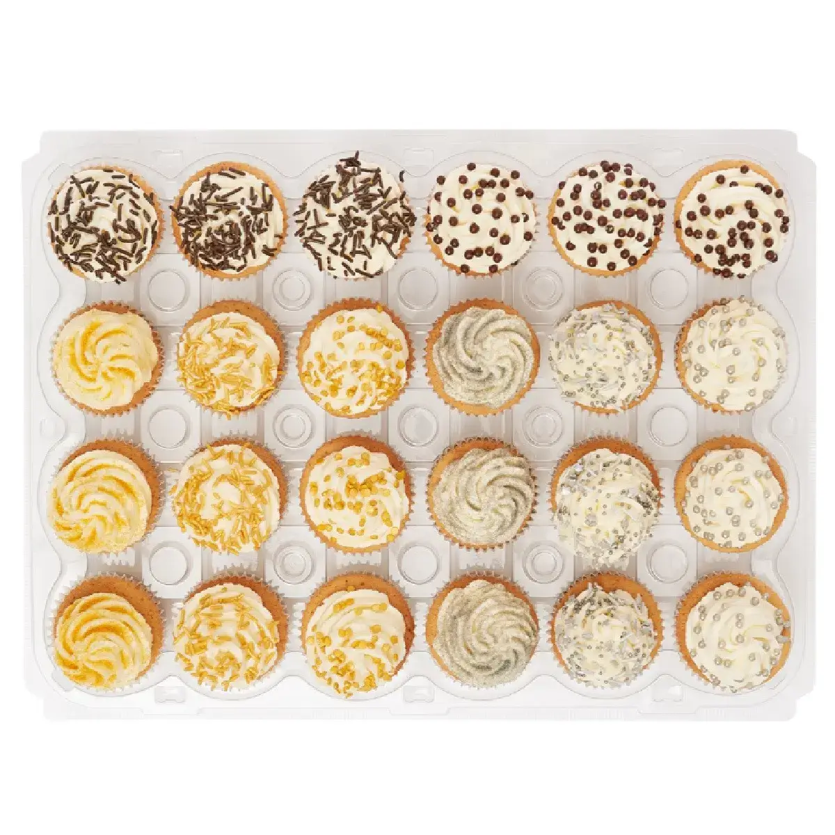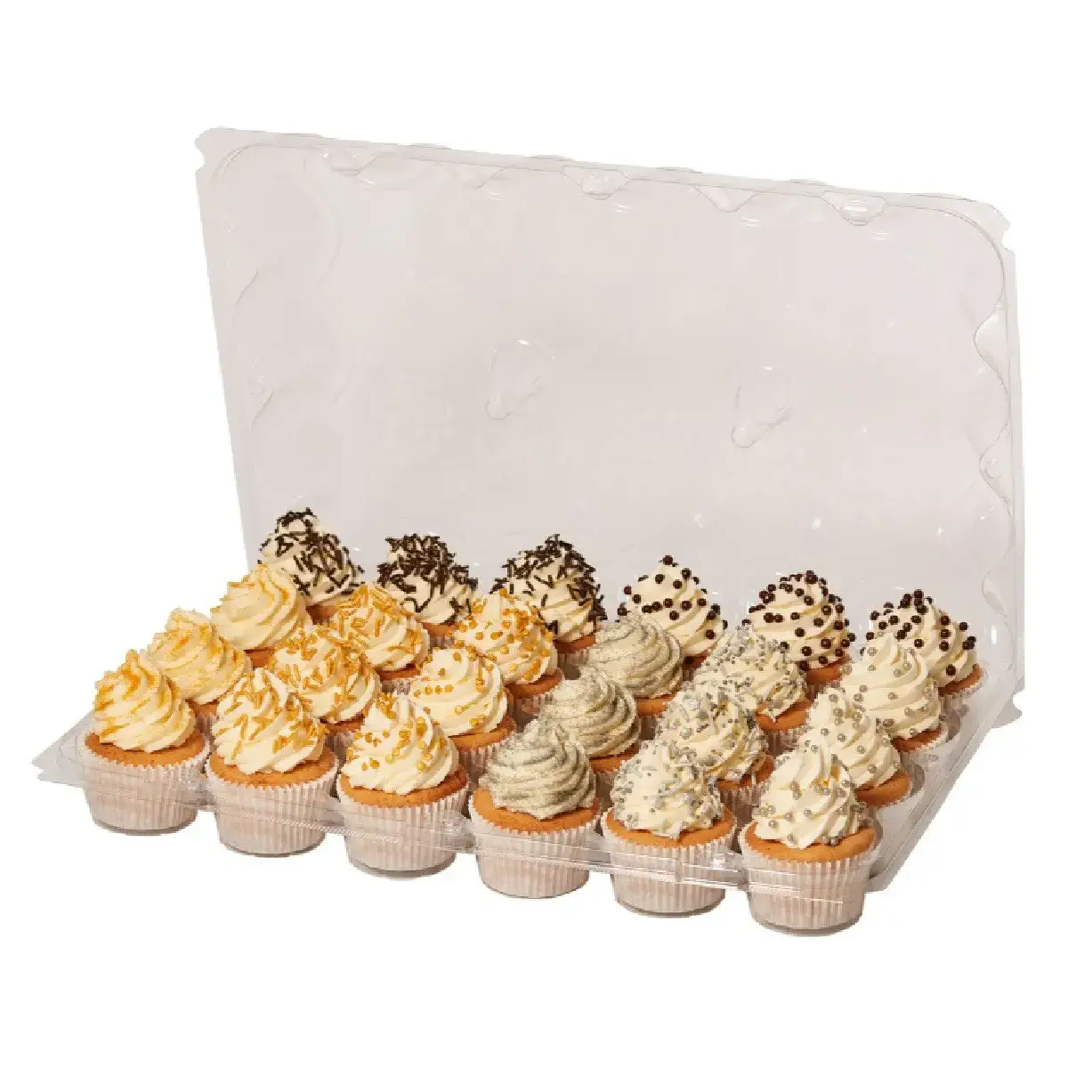 Elke houder is uitgerust met 24 holtes die voldoende ruimte bieden voor cupcakes met frosting, sprinkles of andere decoraties.